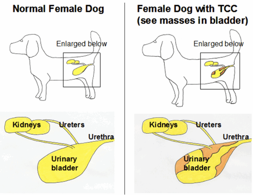정상견(좌)과 방광 이행상피암종 환견(우) 모식도 (사진=Purdue University College of Veterinary Medicine)