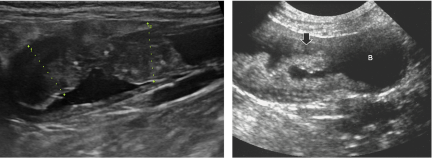 복부초음파에서 관찰되는 방광 이행상피암종(좌)과 용종성 방광염(우) (사진=Small Animal Diagnostic Ultrasound, 4th ed)