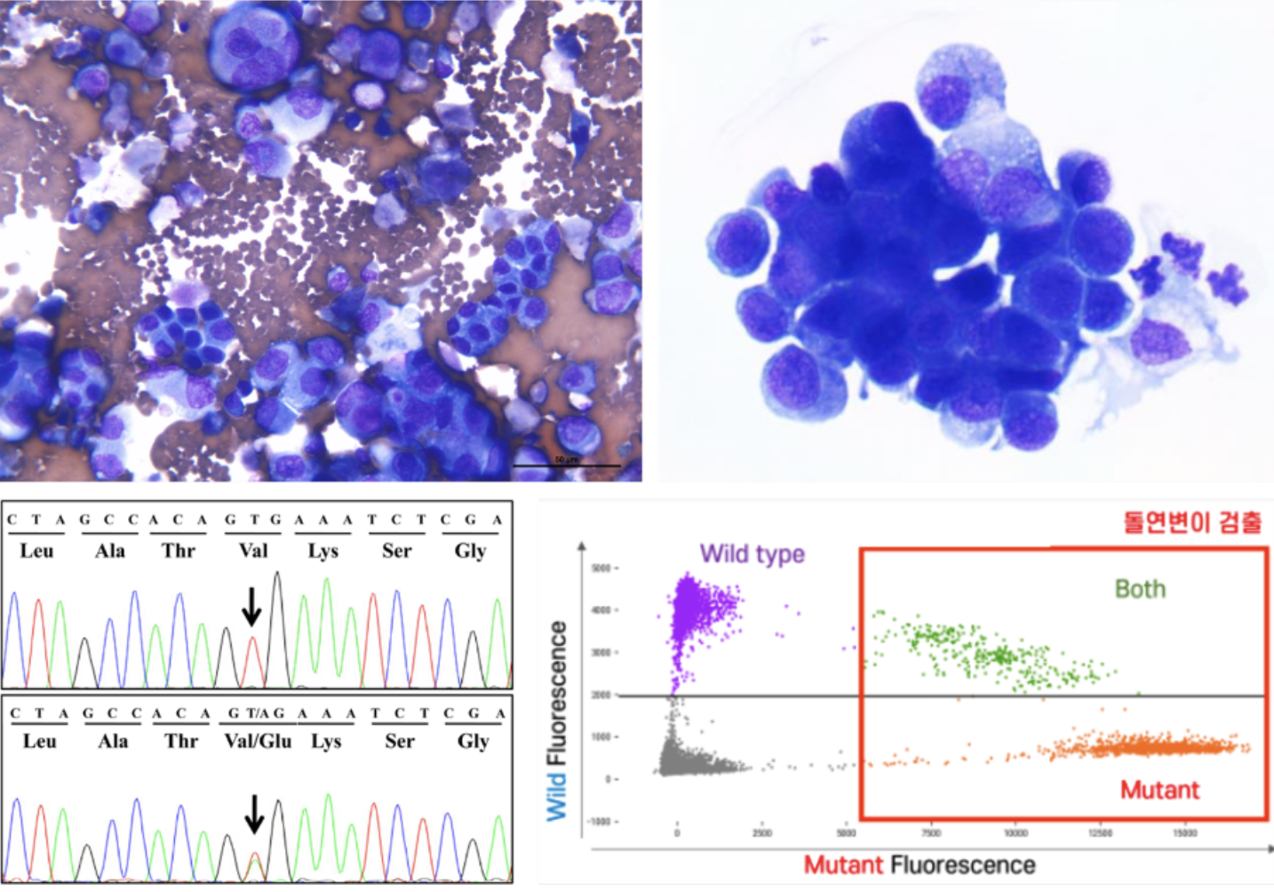 세포검사를 통한 종양 세포 확인(위) 및 BRAF 유전자 돌연변이 검사(아래) (사진=(주)펫온코케어)